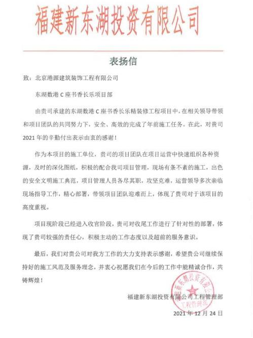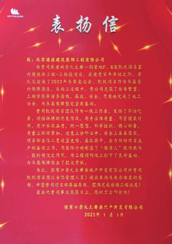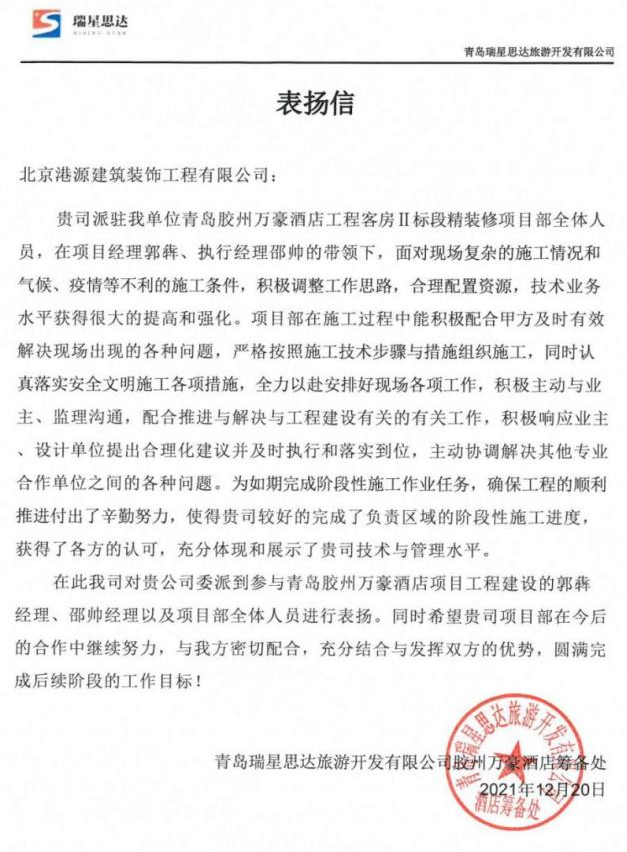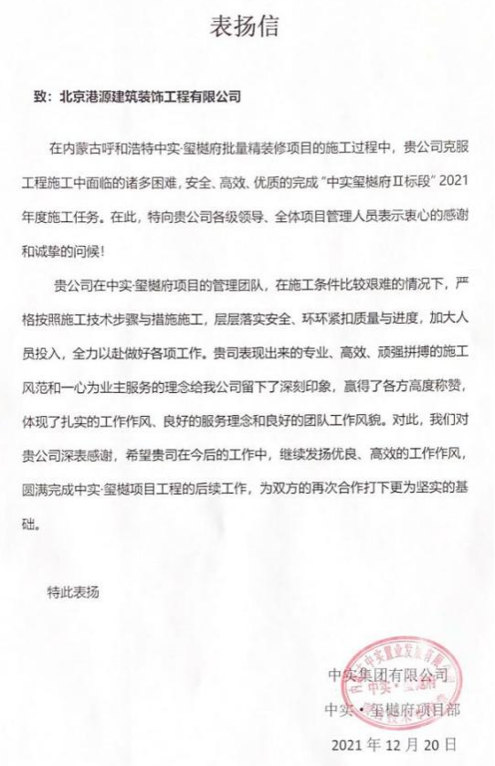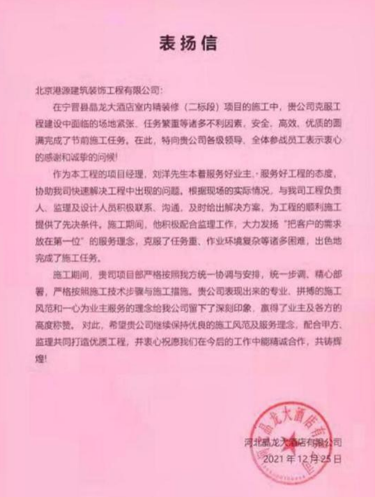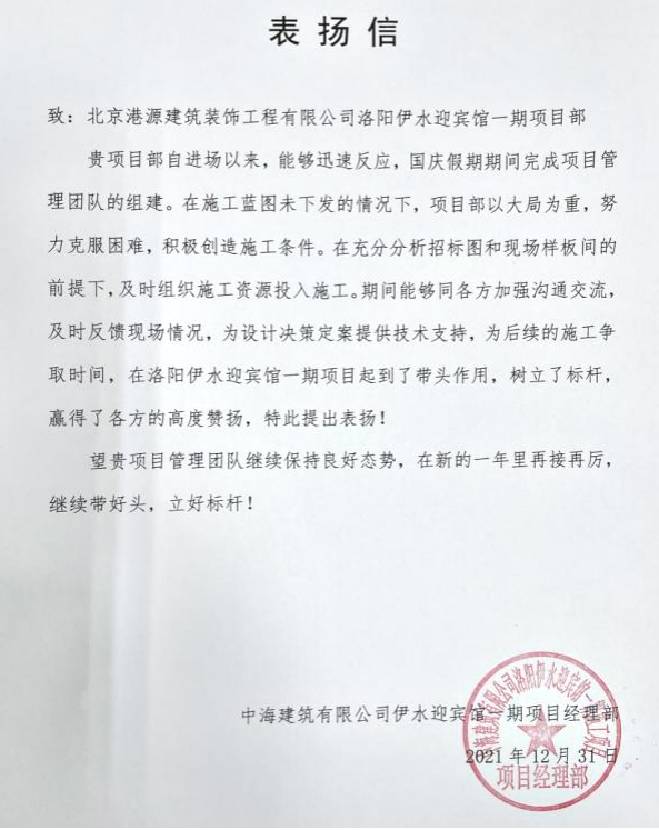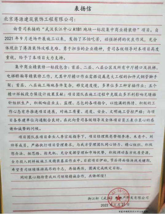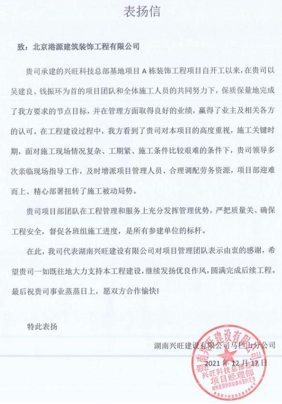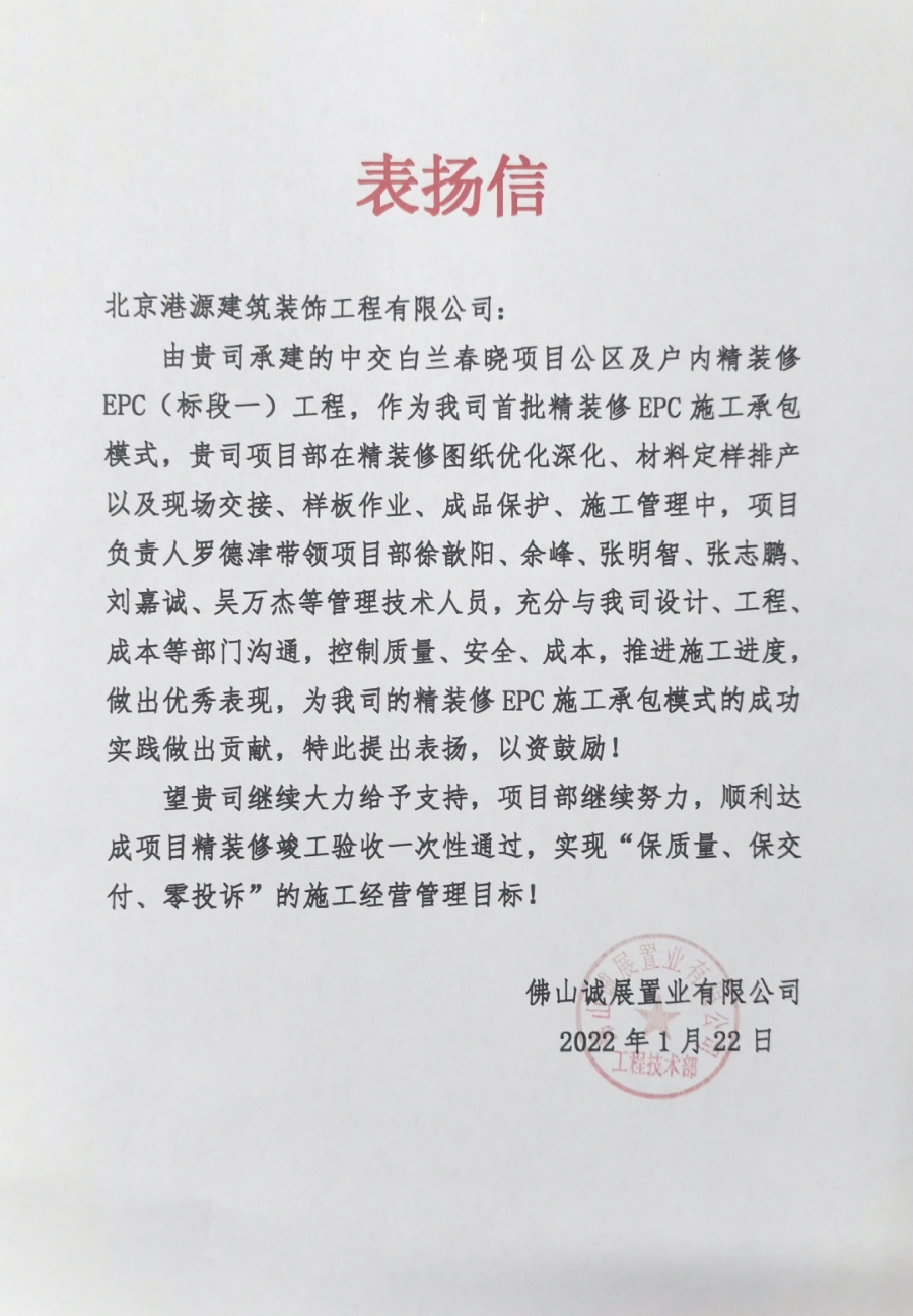 一封封表揚(yáng)信、感謝信,是對(duì)港源品牌的認(rèn)可,也是對(duì)全體項(xiàng)目管理人員付出的肯定,更是鞭策我們不斷提高服務(wù)質(zhì)量的動(dòng)力。在今后的施工管理服務(wù)中,北京港源將堅(jiān)持以“讓客戶更滿意”為宗旨,以適應(yīng)客戶的多樣化需求。