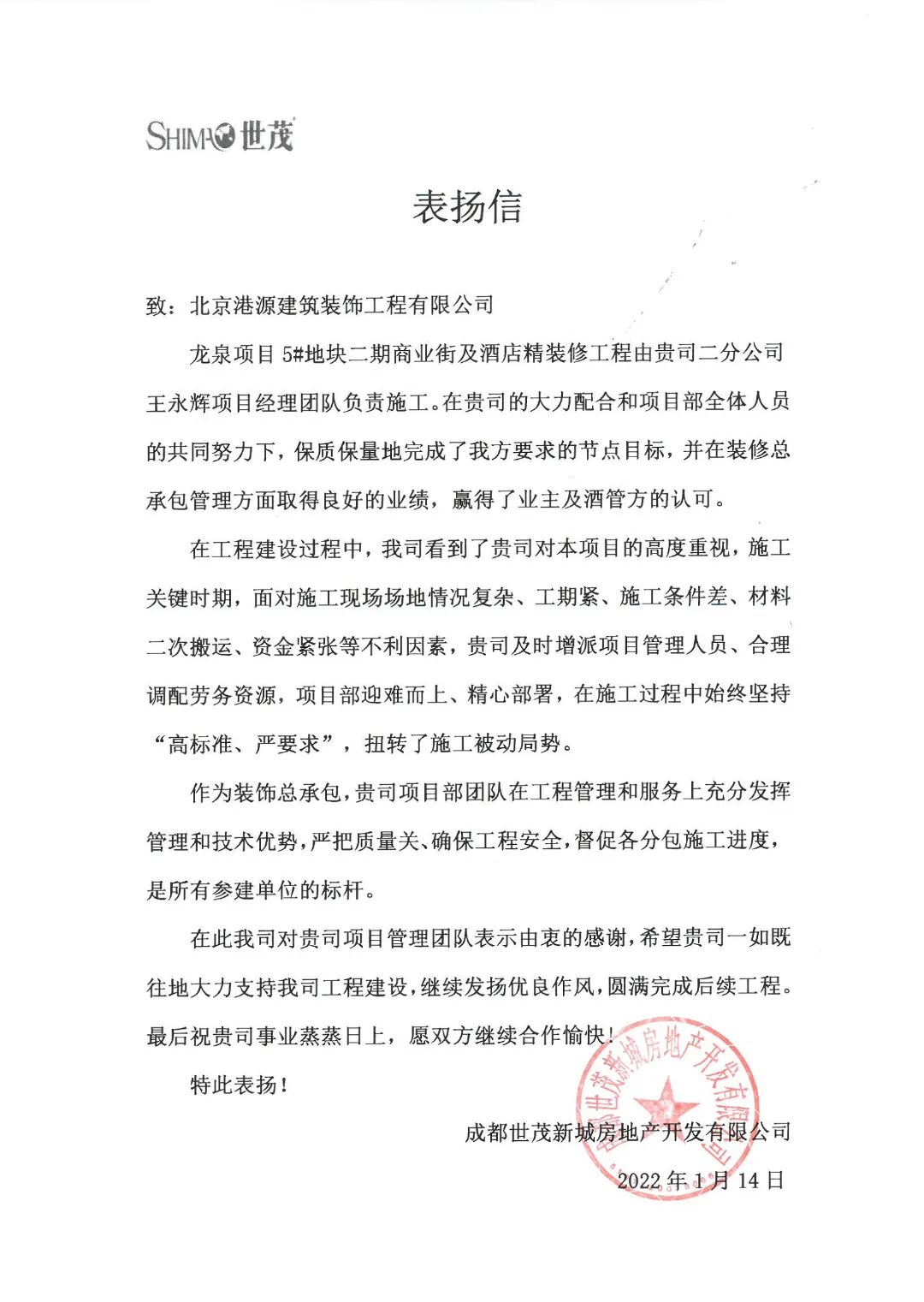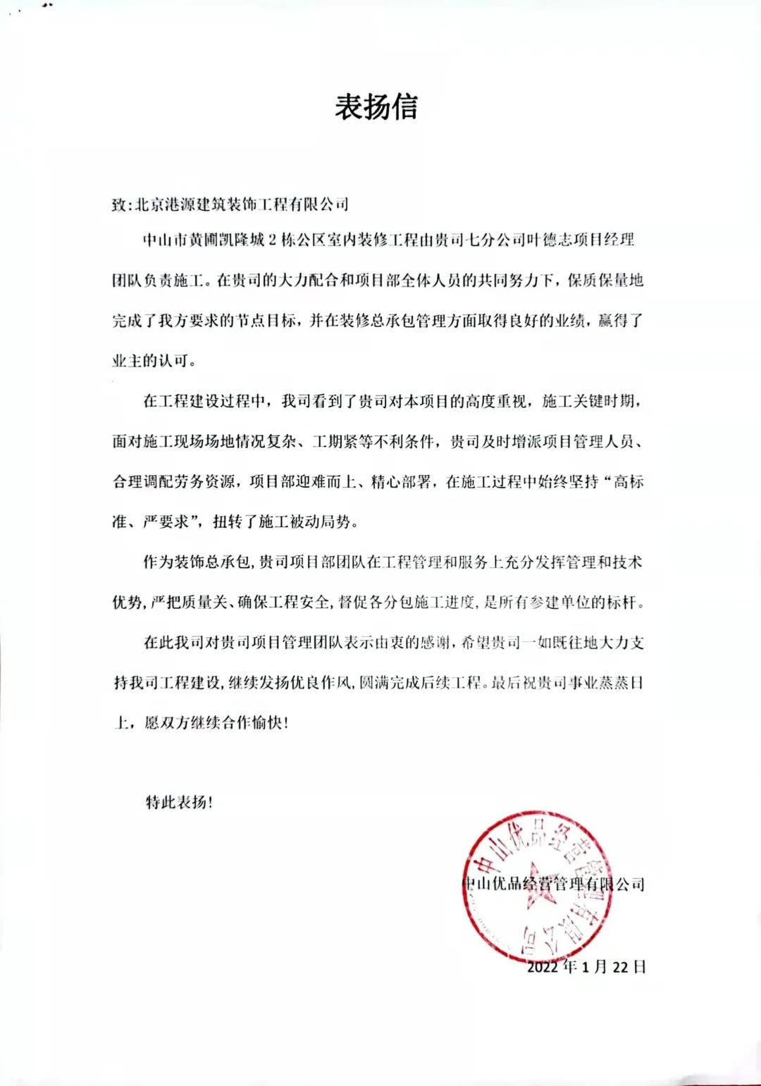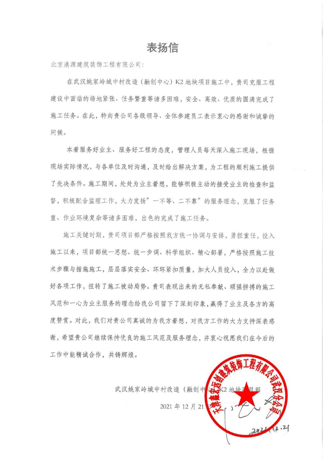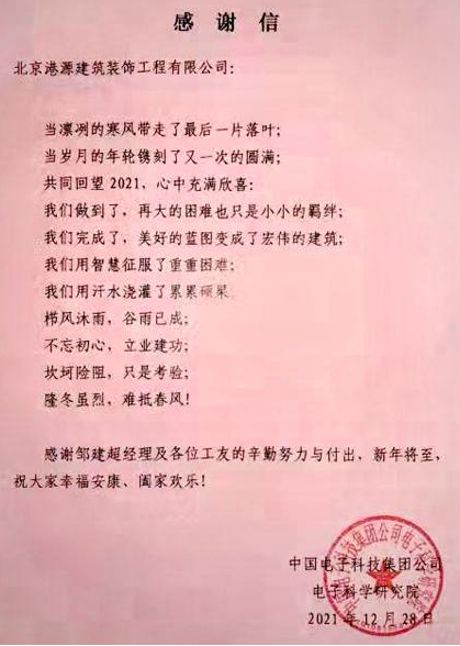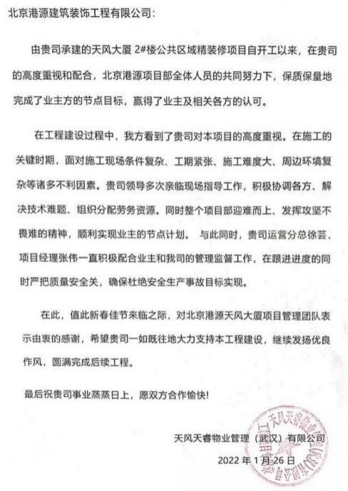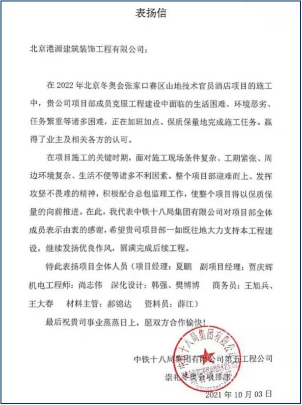 一封封表揚(yáng)信、感謝信,是對(duì)港源品牌的認(rèn)可,也是對(duì)全體項(xiàng)目管理人員付出的肯定,更是鞭策我們不斷提高服務(wù)質(zhì)量的動(dòng)力。在今后的施工管理服務(wù)中,北京港源將堅(jiān)持以“讓客戶更滿意”為宗旨,以適應(yīng)客戶的多樣化需求。